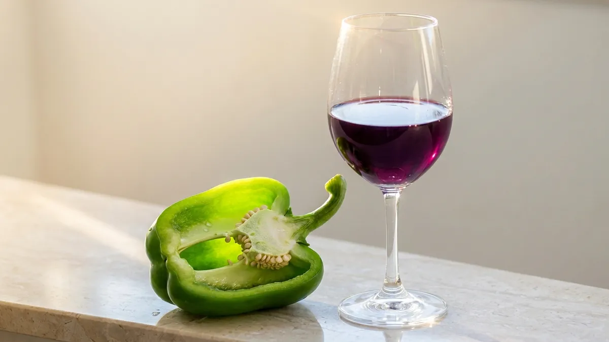 The bell pepper note comes from pyrazines — naturally occurring compounds in under-ripe grapes. Carménère ripens late, so harvested early it can taste aggressively green. When fully ripe, the pyrazines integrate into a more pleasant savory, herbal layer. A faint bell pepper hint is part of the grape's signature; a dominant green note suggests under-ripe fruit.