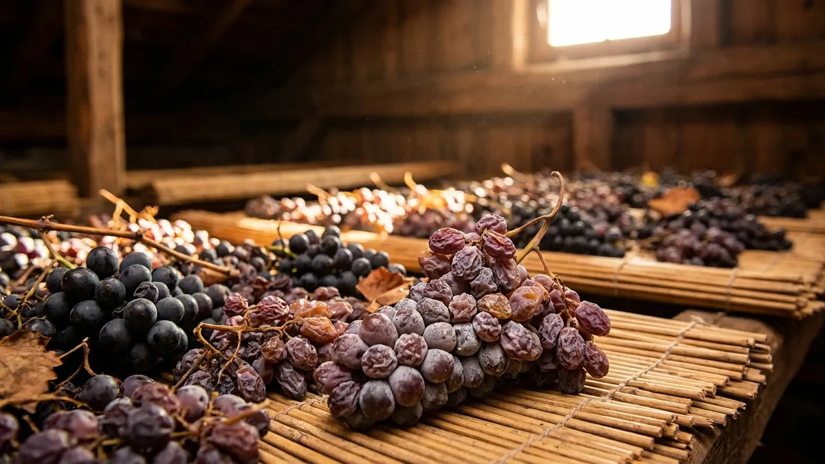 After harvest, the best Corvina bunches are laid out on bamboo racks (called graticci or arele) or in shallow plastic crates inside well-ventilated drying lofts called fruttai. Modern producers often use temperature-and-humidity-controlled chambers to manage rot risk and ripening curves more precisely.
