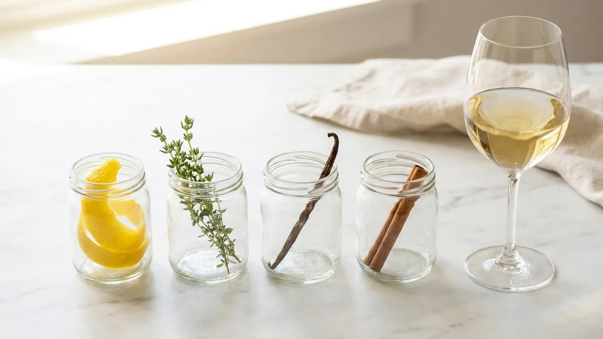 Almost nothing. Six identical wine glasses for side-by-side tastings, a small notebook, a kitchen scale or measuring jug for consistent pours, and a few pantry items for the smell drills (whole spices, citrus zest, fresh herbs, a coffee bean). A neutral wine glass — INAO-style or a basic Bordeaux shape — is the only purchase that meaningfully changes results. Skip aerators, decanters, and tasting kits for the first month.