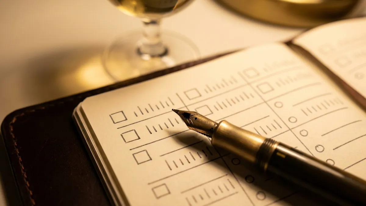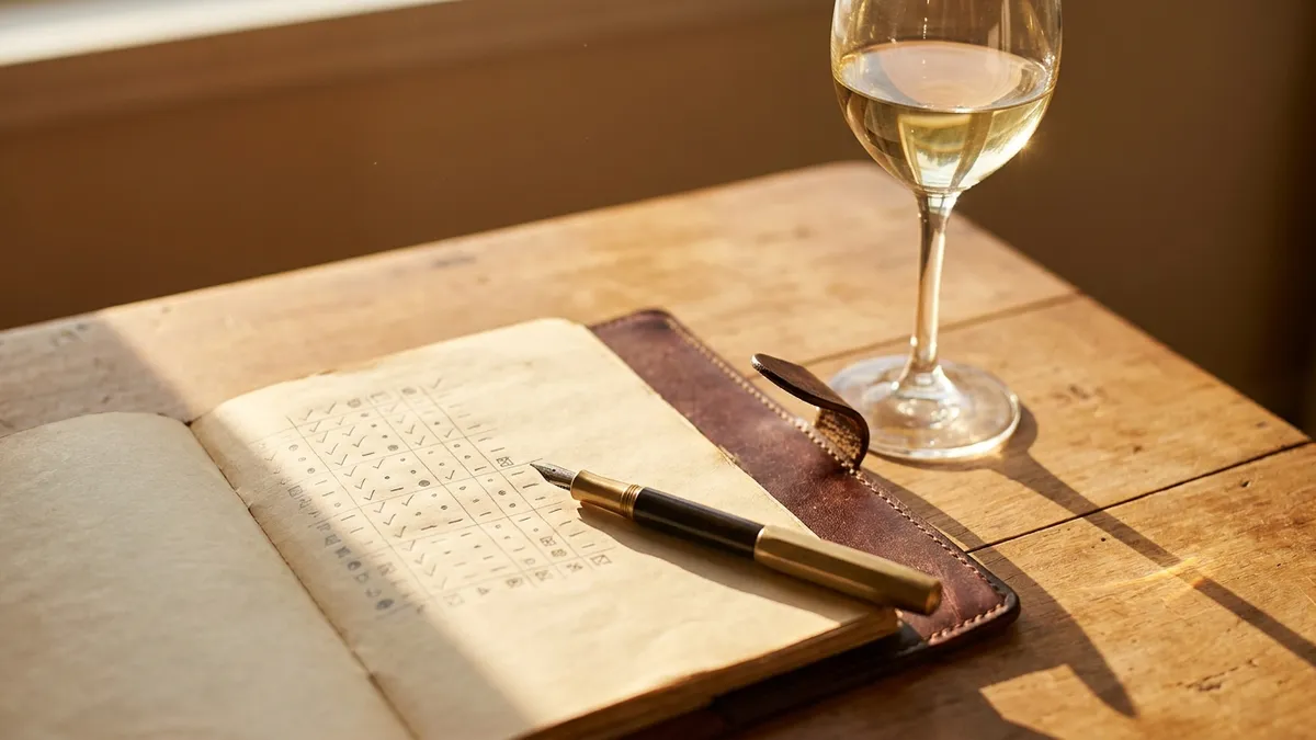 Common mistake: writing for an audience. Most week-two journals collapse into florid prose by day eleven. Write medium acid, light tannin, red cherry, earth, eight-second finish — not a delicate dance of red fruit on the palate. Plain language survives review. Label-copy does not.