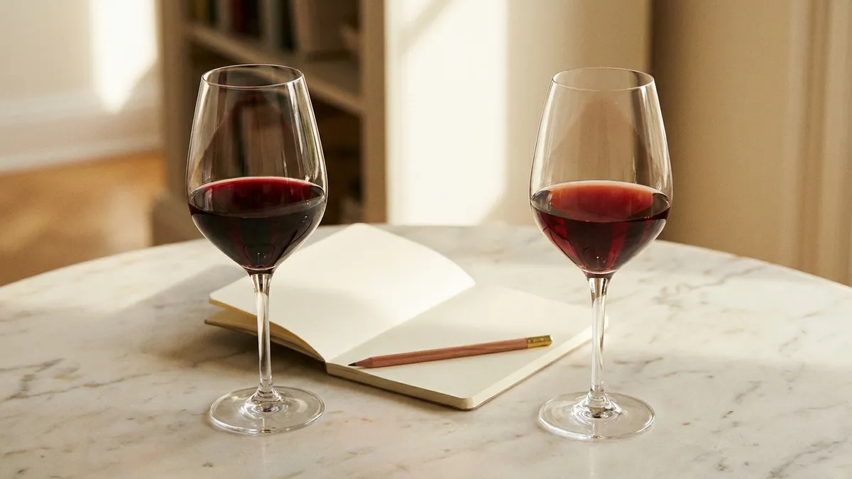 Put both bottles on the table at the same time. Set out two matched glasses, a glass of still water, plain crackers as a neutral palate cleanser, and your notebook or tasting log open to a fresh page. No food on the table. No coffee or chewing gum in the previous thirty minutes. No strong perfume or ambient cooking smells in the room.