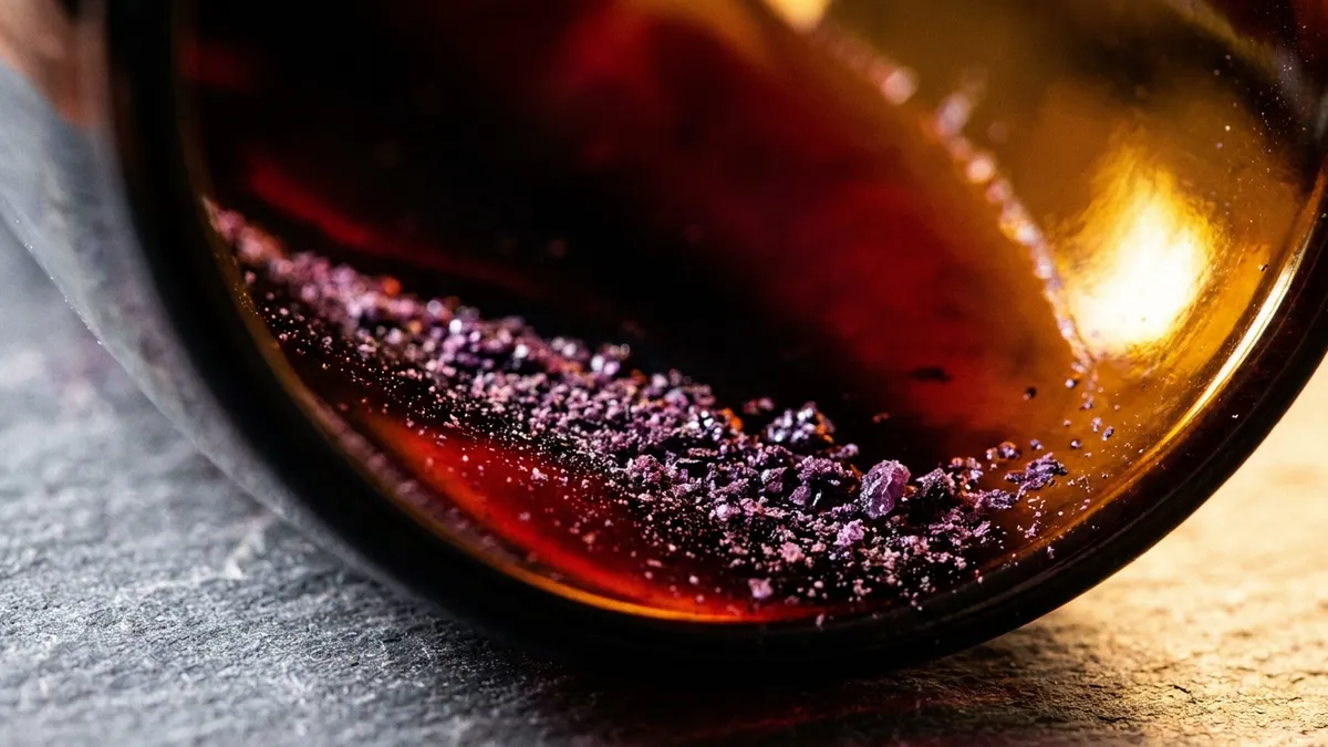 Old red wines throw sediment — solid particles of precipitated tannin, color pigments, and tartrate crystals that drop out of the liquid over years in bottle. Sediment is harmless but gritty in the mouth and aesthetically distracting in the glass.