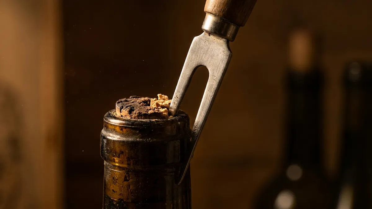 For wines older than 15 years, use an Ah-So (a two-pronged extractor). Slide each prong between the cork and the bottle in alternating motions, then twist and lift the cork out whole. A worm-style corkscrew is more likely to shred a fragile cork. Stand the bottle upright a day before opening so any sediment settles to the bottom.