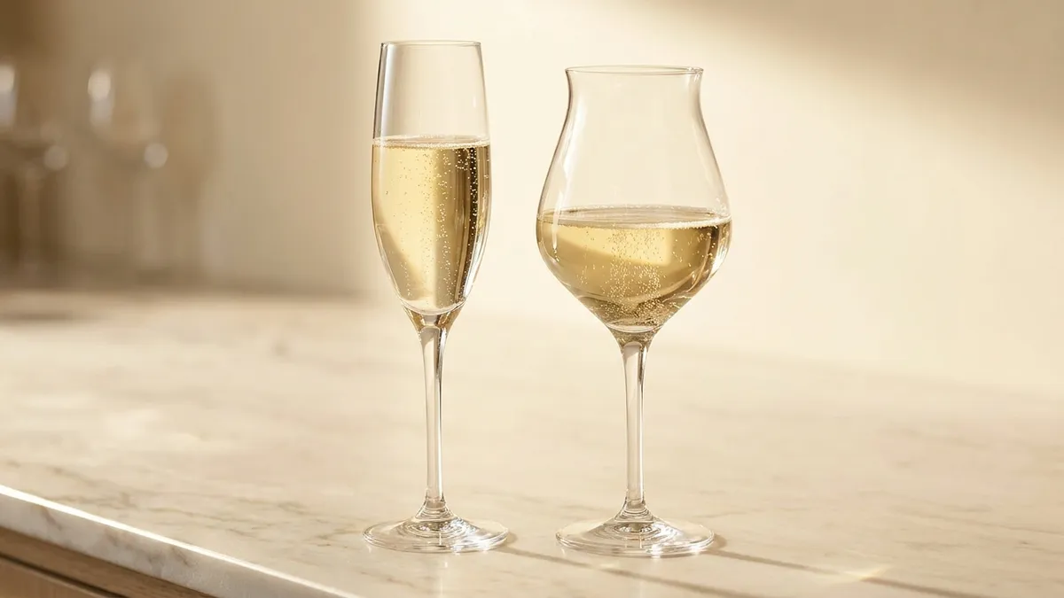 Flutes preserve the bead column and look elegant, but their narrow bowl traps aroma. A tulip glass — wider in the bowl, tapered at the rim — concentrates the autolytic and fruit aromas while still giving the bubbles a center column to rise through. For serious tasting, a tulip or even a white wine glass beats a flute on aroma every time.