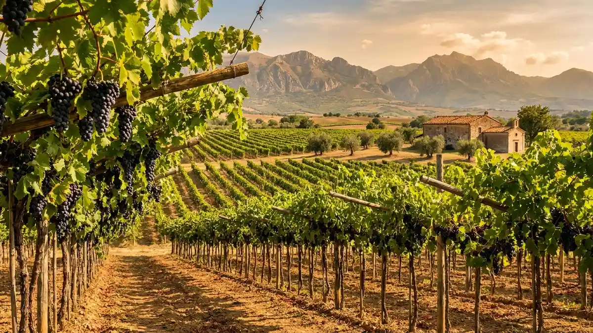 The grape thrives in the warm, sun-drenched hillsides of Italy's central Adriatic coast. The Apennine mountains protect vineyards from inland weather while the sea moderates summer heat — a combination that lets Montepulciano ripen fully without losing acidity.