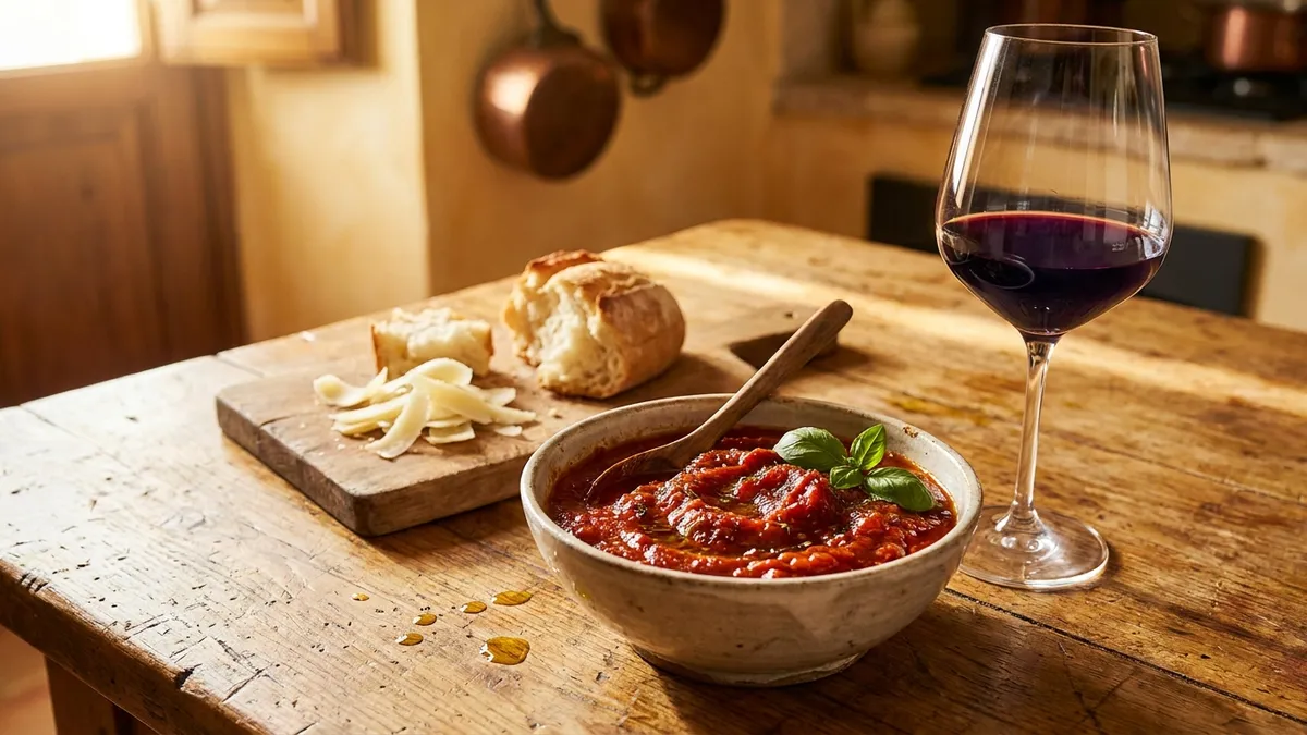 - Slow-cooked tomato dishes — Lasagna, ragu alla Pugliese, orecchiette al sugo, eggplant parmigiana. The wine's sweet fruit absorbs tomato acidity instead of clashing with it.