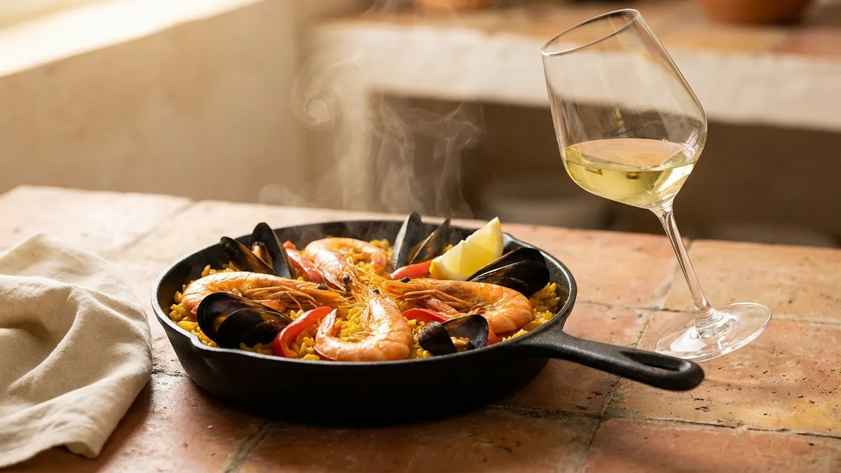 - Paella — particularly seafood paella or mixed paella with chicken and shellfish. The wine handles the saffron, the rice's umami, and the seafood without flinching.
