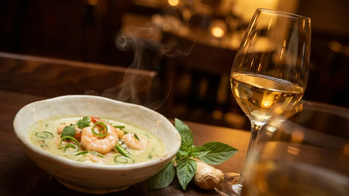 - Thai green curry with chicken or prawns — coriander, lemongrass, and coconut find a perfect echo in the wine's apricot perfume