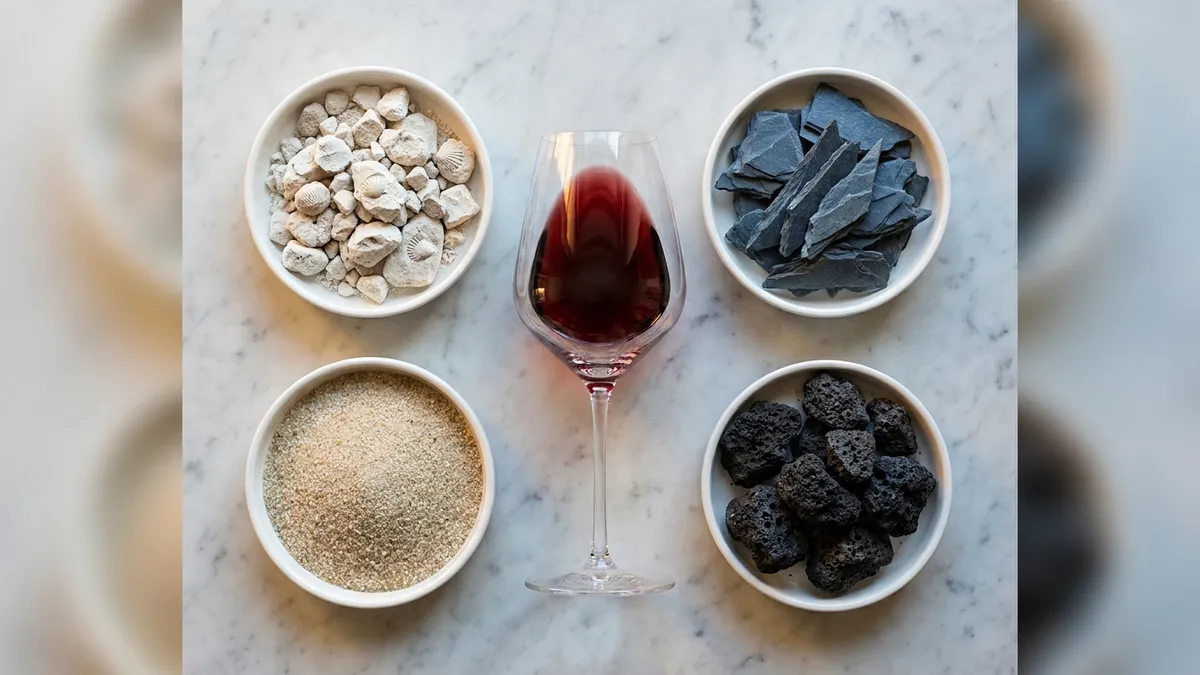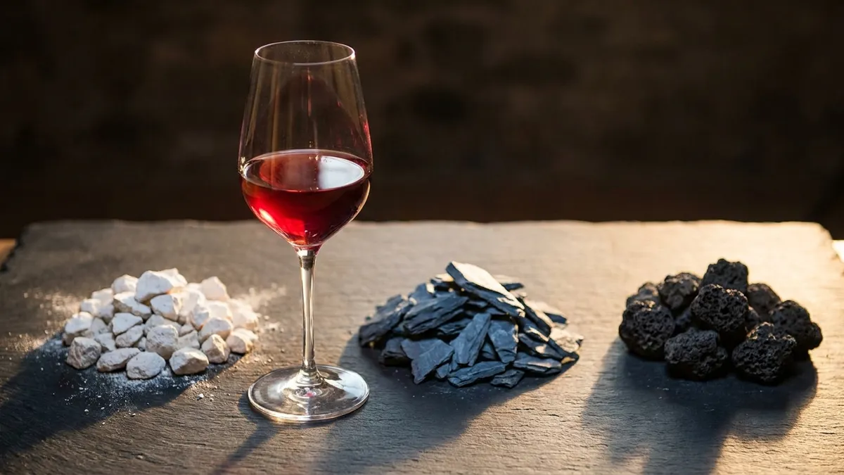 Limestone, slate, and volcanic soils are the three most recognizable. Limestone (Chablis, Champagne, parts of Burgundy) produces a chalky, mineral finish with high acid. Slate (Mosel, Priorat) gives wet stone and a petroleum-like edge in aged Riesling. Volcanic (Etna, Santorini, Canary Islands) produces salinity and a smoky, lava-tinged minerality you can pick out blind.