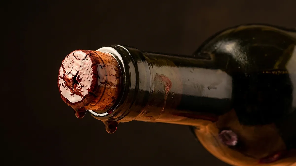 Wine seeping past the cork shows up as a sticky brown crust under the capsule or a small dribble down the neck. Either signals a failed seal — too much oxygen has reached the wine, and oxidation has already started.