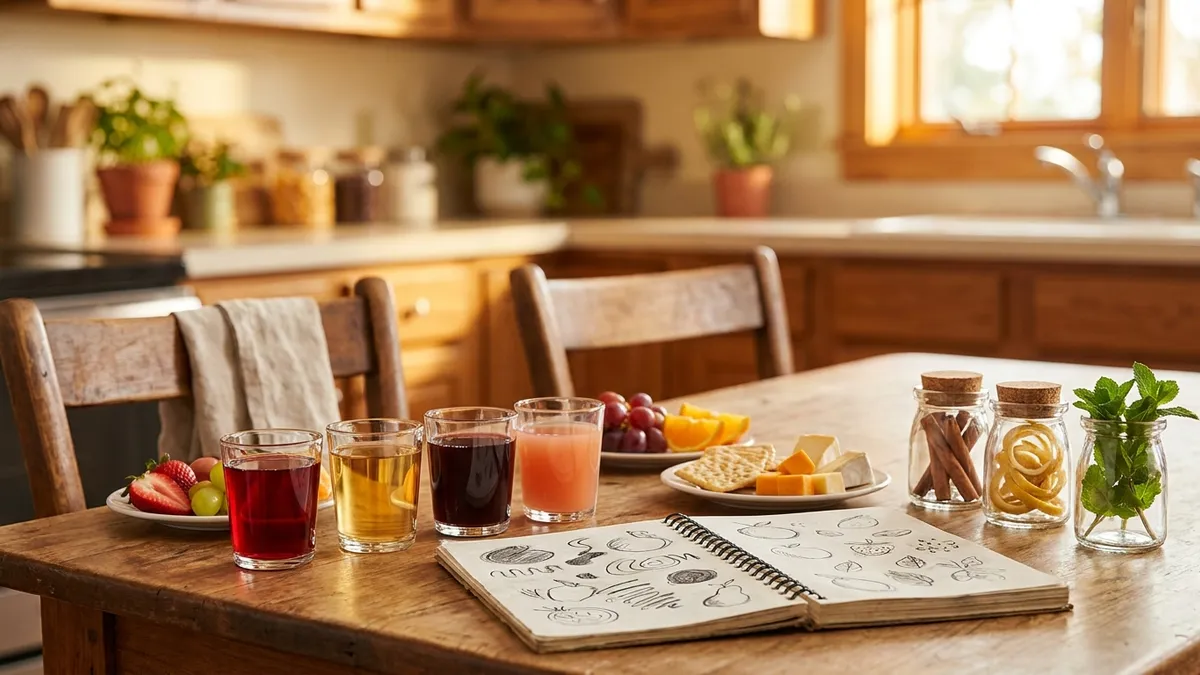 A first sensory session at home does not need elaborate setup. Three glasses, three juices, a few small plates of fruit and herbs, and a quiet fifteen minutes. Walk through sight, smell, sip, structure — even one rotation through the framework is enough to plant the seed.