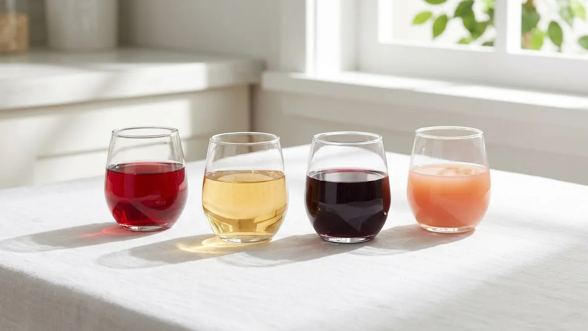 Choose three to five visually distinct juices: white grape, red grape, apple, pomegranate, and pear are reliable starters. Add an unsweetened herbal tea like chamomile or hibiscus for color and aroma variety. Use clear stemless glasses or small tumblers so children can compare colors against a white background, just as adults do with wine.