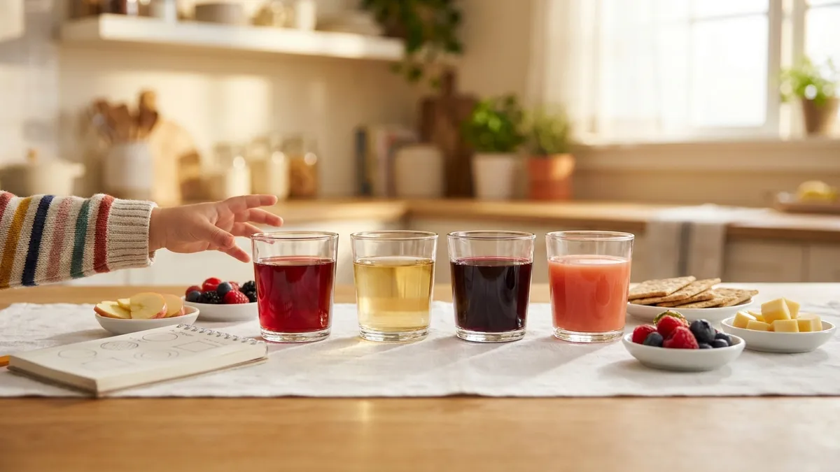 Frame it as sensory exploration, not adult imitation. Do not pour juices into wine glasses with stems if that visual reads as "playing wine" to the child. Stemless tumblers, small juice glasses, or even labeled tasting cups work. The activity stands alone; it does not need to look like a dinner party.