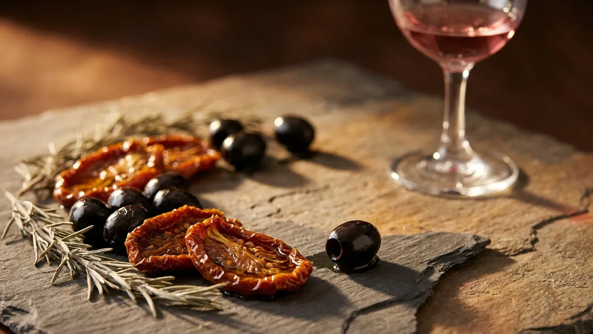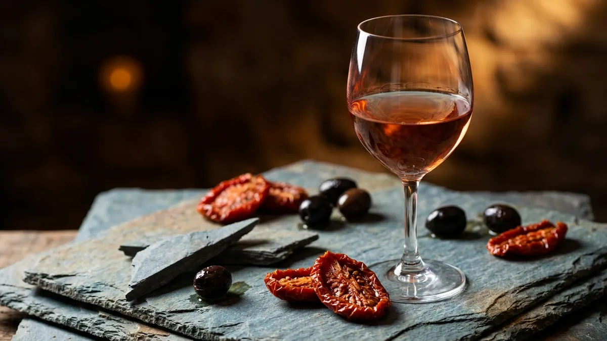 The pairing of dried tomato and olive is the giveaway combination. Few other red grapes produce both at the same time, and the savory, sun-baked Mediterranean profile is unmistakable once you have it locked in.